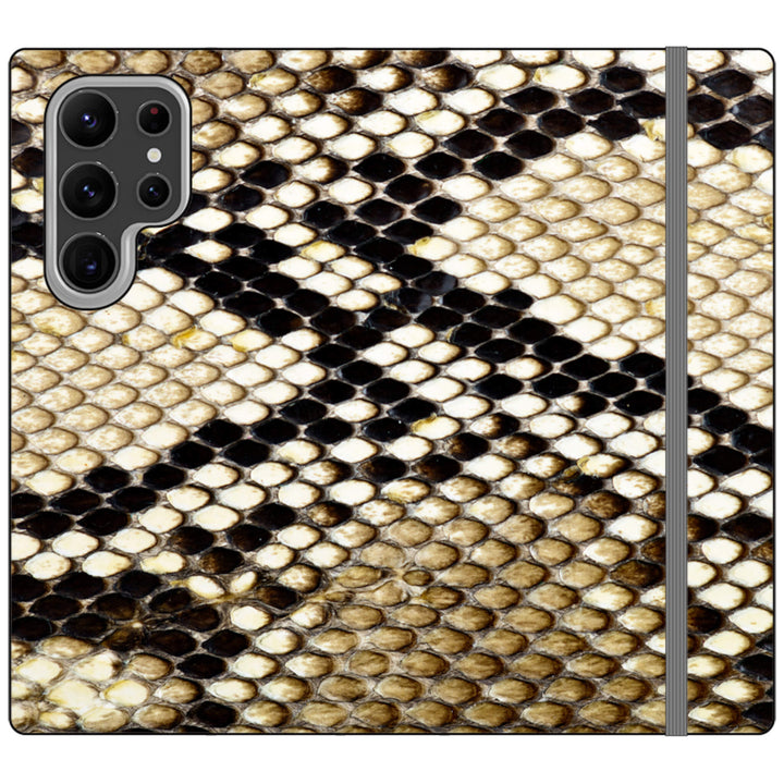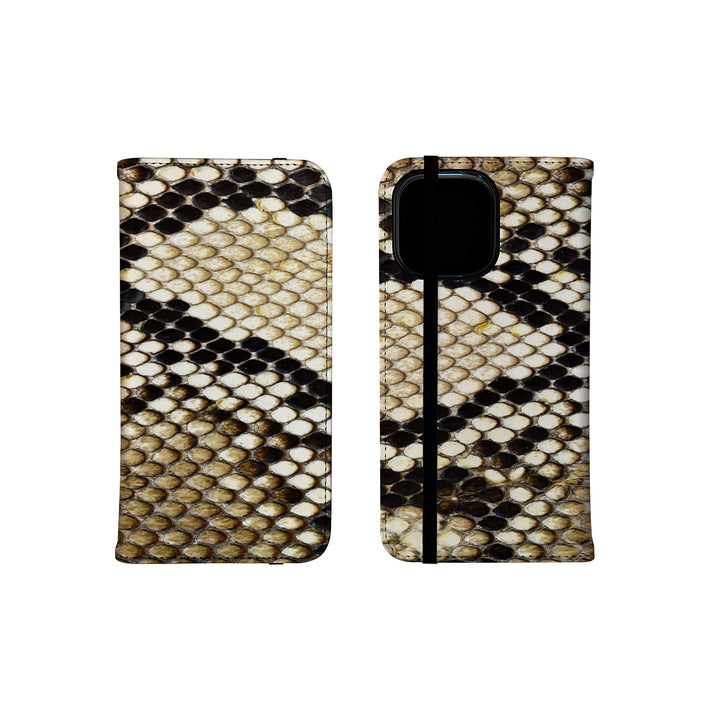 Elevate your style and functionality with this Serpent Chic Design Folio Case for both iPhone and Samsung Galaxy, crafted from premium vegan leather. This folio case features a grey elastic fastening and four interior pockets for convenient card and cash storage. Its stand feature allows for easy media viewing.