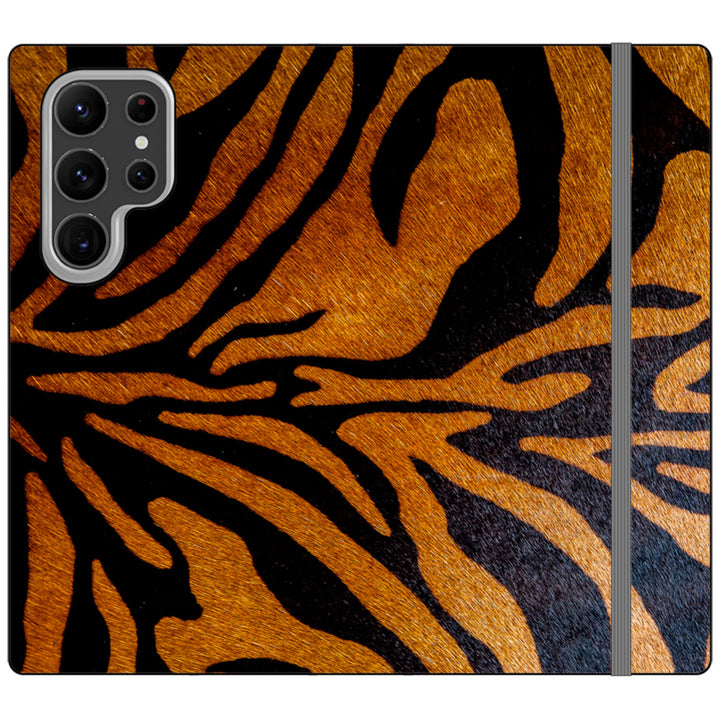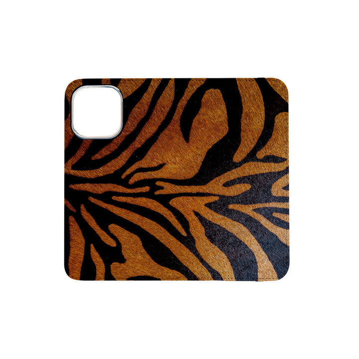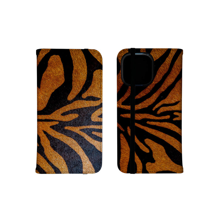 Elevate your style and functionality with this Stripes of the Wild Design Folio Case for both iPhone and Samsung Galaxy, crafted from premium vegan leather. This folio case features a grey elastic fastening and four interior pockets for convenient card and cash storage. Its stand feature allows for easy media viewing.